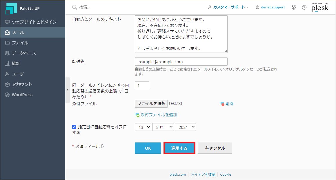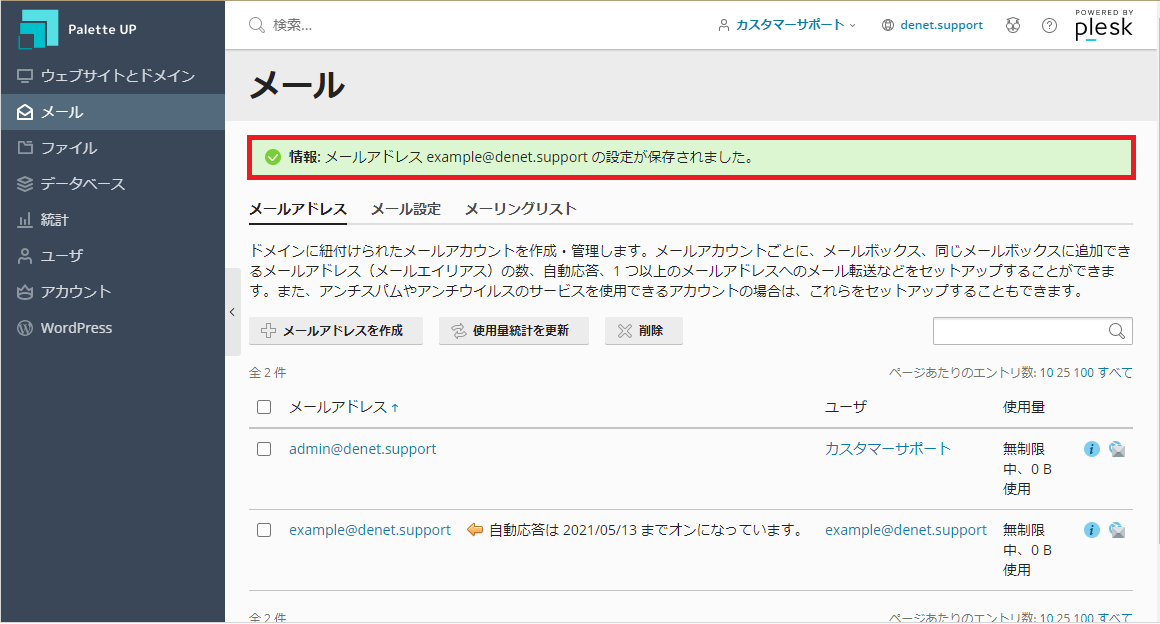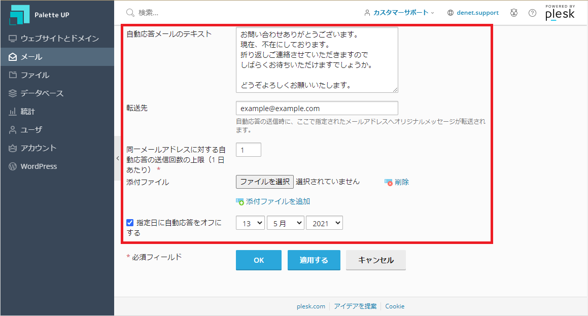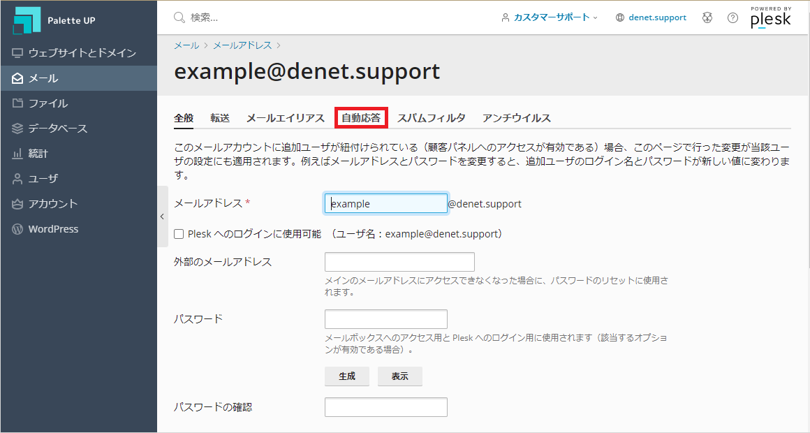 Palette UPのメールには自動応答機能があります。この機能をご利用いただきますと、あらかじめ設定したメールが自動的に返信されます。届いたメールに対してご返信ができないお休みや長期出張時にご利用くださいませ。