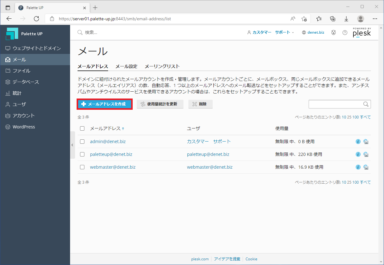 | メールアドレス | 設定されるメールアドレスを入力します |