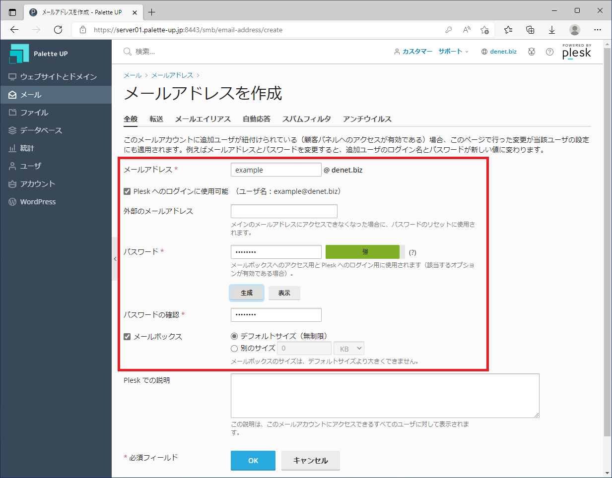 | Pleskへのログインに使用可能 | チェックを入れます |