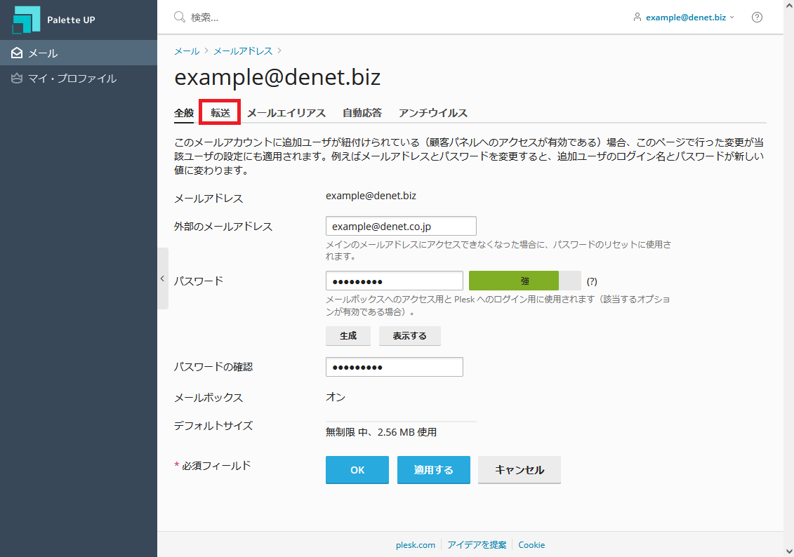 | 転送されたメールのコピーをPleskメールボックスに配信しない | 転送先にだけメールを配信させる場合はチェックを入れます。 |
