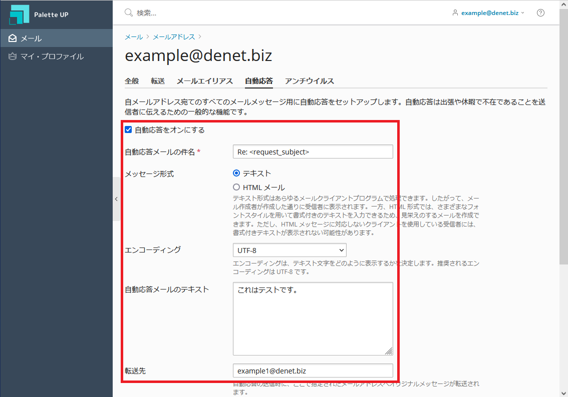 | 転送先 | 自動応答送信時に受信したメールを転送させたい場合は転送先メールアドレスを入⼒します。 |