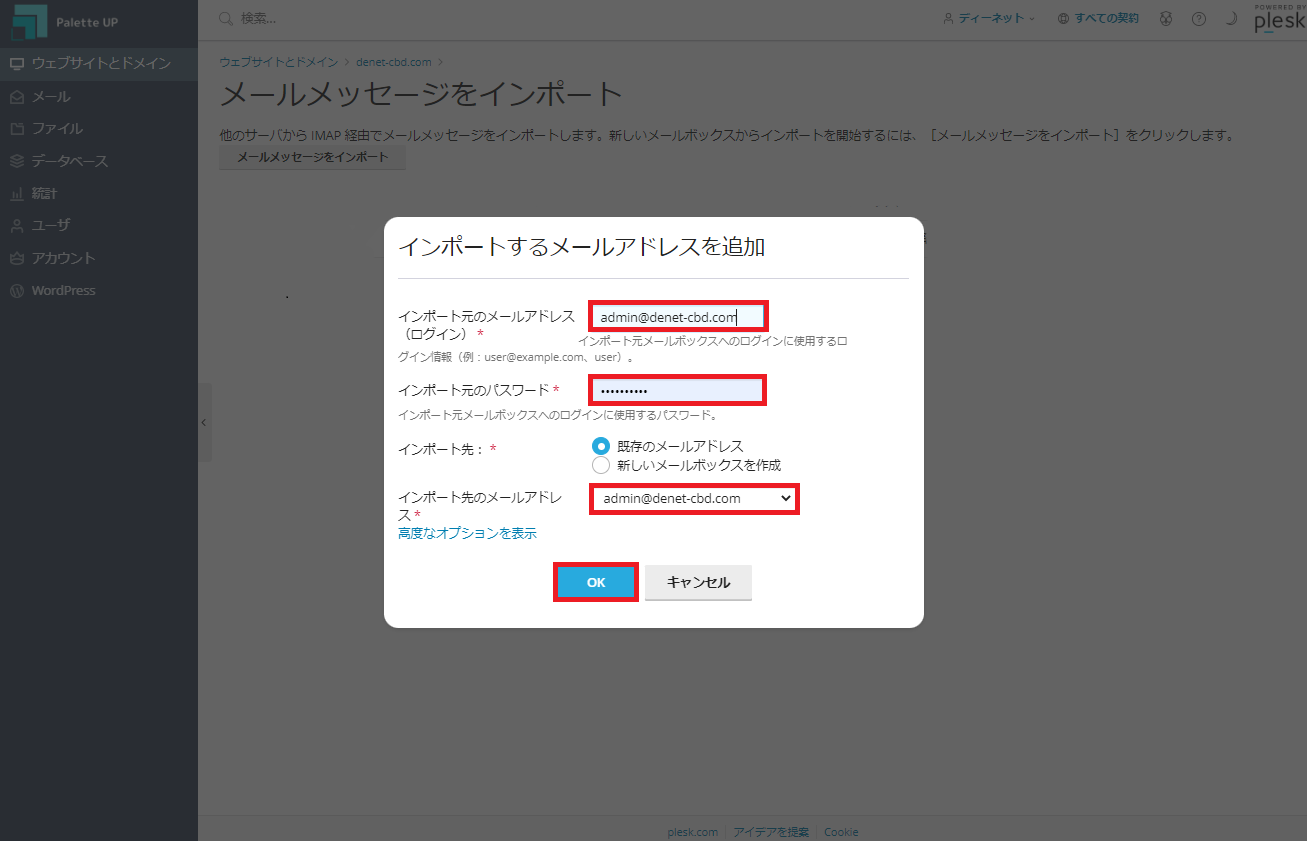 4「インポートするメールアドレスを追加」が表示されましたら、インポート元のメールアドレス情報を入力し、「OK」をクリックします。