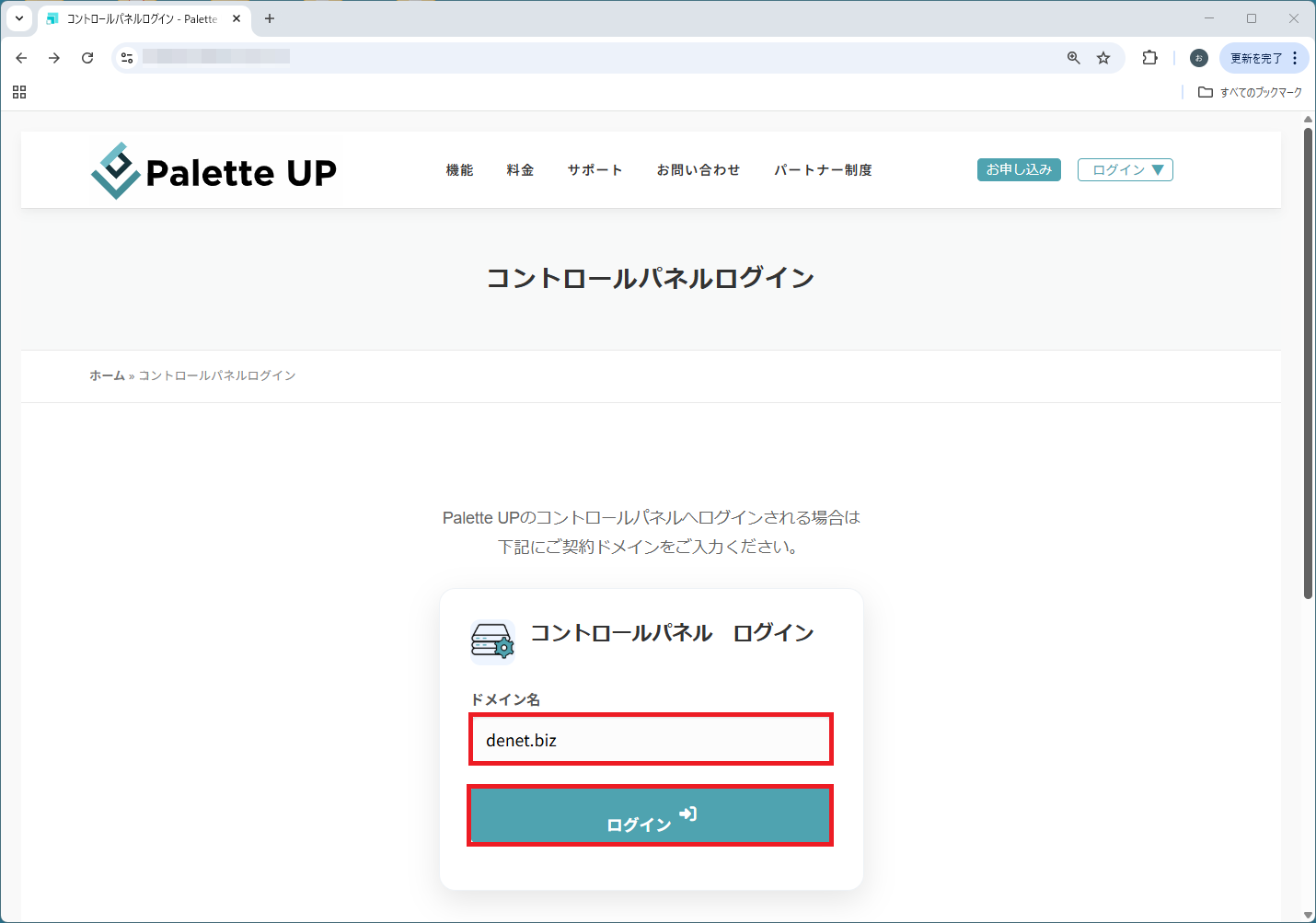 コントロールパネルログインで「ドメイン名」欄にご契約ドメインを入力後、「ログイン」をクリックします。